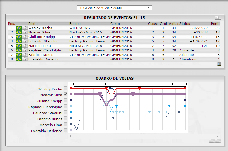 No 1º pit sai com Wesley embutido na reta e ele tomou minha frente na primeira curva, e aí acabaran minhas chances de buscar o Giuliano , porque o Migué tava numa noite sem muita inspiração e meio lento rsrsrs e me segurou por umas 4 voltas... passei mas já era tarde, vem o 2º pit e saí mais de 10 segundos atras, foi mesmo levar até o fim... nem tudo foi tranquilidade porque algumas curvas antes do fim o freio arrebenta, quase me estabaco no muro... mas consegui controlar e ai sim completar e subir o 2º degrau do podium...